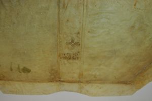 Two identical stamps placed symmetrically on upper left and bottom right corners of aa1. On the top a shape resembling the letter omega. In the center two opposite facing semicircles (or C's) interlocked with a full circle (or O). On the bottom, a small cross.