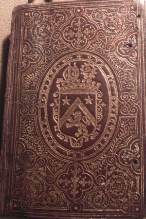 Gold-tooled fillet towards outer edges of boards on brown mottled calf binding, with gold-tooled armorial centrepiece (unidentified: ducal coronet; quarterly (one and four) lion rampant with eight crescents[?], tower with turrets (two and three), over all chequered.