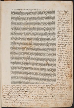 Transcription: "Gli hedifici simili a' Romani anzi non è maraviglia che 'l grand'animo dei Fiorentini da quella città pigliar volesse l'essempio, al quale la sia hedificasse, la q... in que' tempi più gloriosa era, e più famosa. Et anche esser potente (?) che cotali nomi non da principio fusser posti a quegli hedificij, ma nel processo del tempo, massimamente doppo le barbariche rovine, confuse le genti, si mutassero anche quegli. Et come si dice, et anche si vede, il cibo esser doe simile alla complessione ... dello animale, che si nutrisce, et con quella confarsi, così dir si può che da coloro fusse hedificata Firenze, a quasi simili la mantengono, et de' quali ella come di cibo si nutrisce. Et per quali altri cittadini si mantien Firenze, che per coloro, i quali di tempo in tempo del vicino contado, et delle terre vicine per gli lor met... alla città sono stati tirati? Onde assai ben giudicar puossi, che vicini paesani di maggiore animo in così alta impresa mettesser mano. Per ciò tengo questa più vera oppenione. La quale anche giudico più honorevole: imperoché imaginar non mi so che altro che servili esser per costoro gli animi di coloro, i quali per poche staiora di terreno la propria patria sostenessino abbandonare, et sotto nome di coloni, et di compagni (?) divenir servi de' lor proprij concittadini. Ma quell'origine possiamo disiderar più honorevole, et ricognoscerci nostrij Toscani, il nome de' quali molti secoli gloriosamente fiorì innanzi a quel de' Romani, et mancato lo 'mperio dei Romani, anchor non mo...anamente (?) fiorisce!"